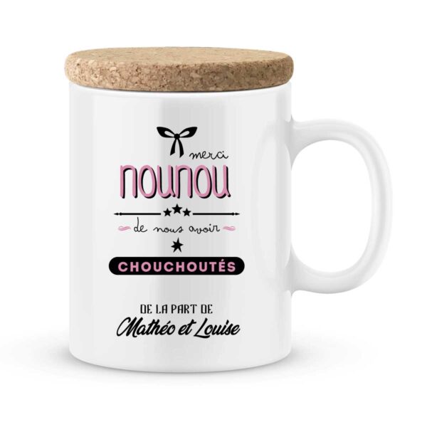 Spécificités techniques : mug personnalisé Céramique blanc avec le(s) prénom(s) de votre choix avec couvercle en liège :